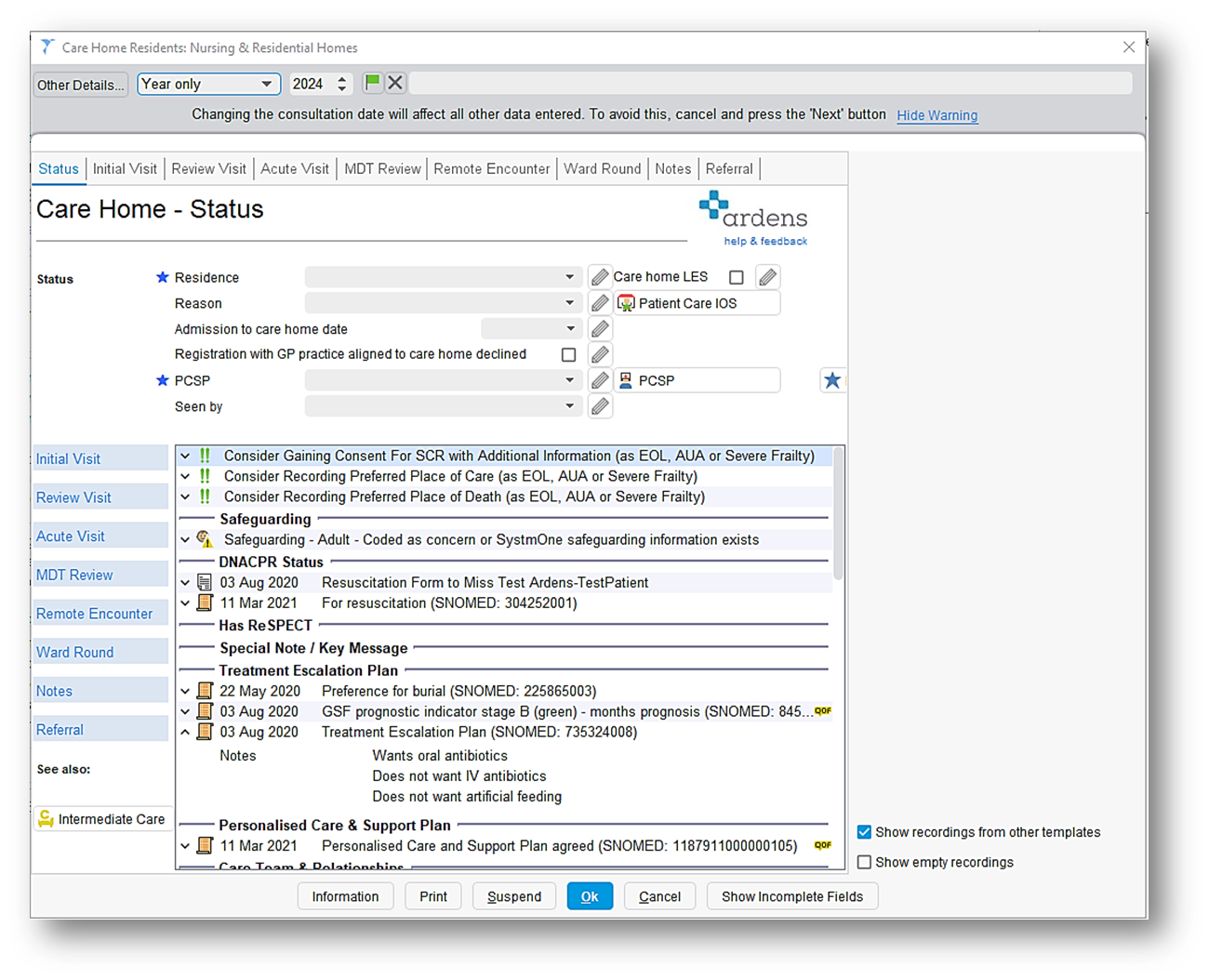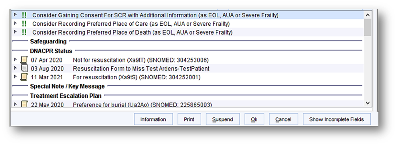 The 'view' or window at the bottom of the template shows information that is currently missing which you may want to consider adding. Below this is any relevant coding previously recorded in the patients record including Safeguarding, DNACPR status, Special Notes & Key Messages, Treatment Escalation Plan, Sharing, Care Plans etc.