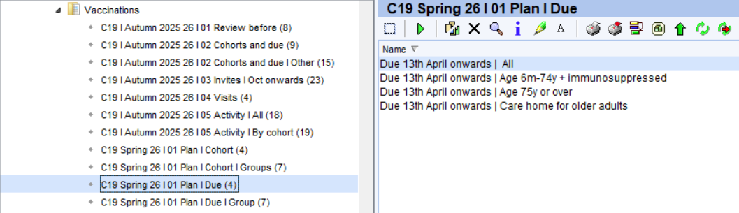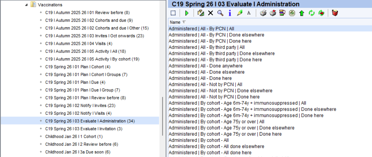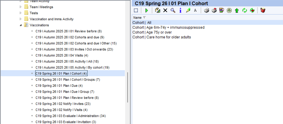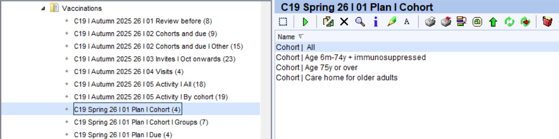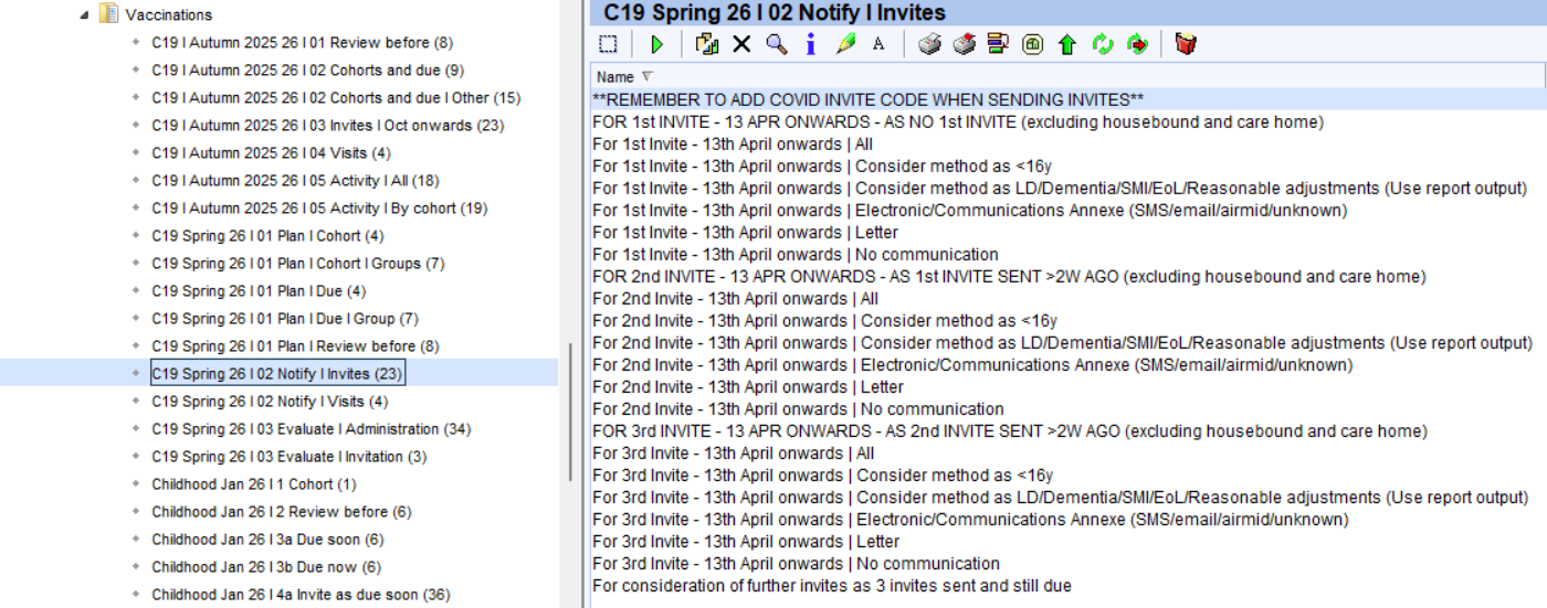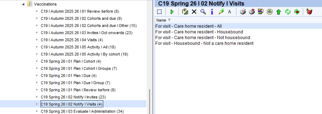 Care home residents and housebound patients are excluded from all the Invite folder. The reports in the 'Visits' folder provide visit lists that can be used to assist in planning these vaccinations.