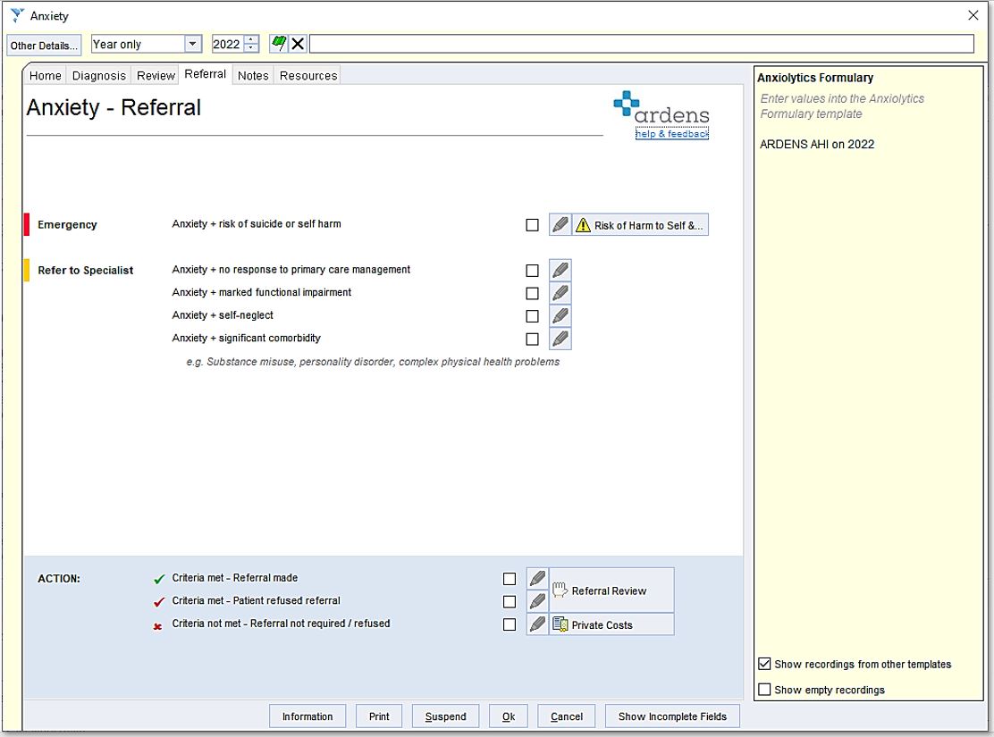 To access the Anxiety template select Auto-Consultation > ardens CONDITIONS MENTAL HEALTH and select Anxiety.